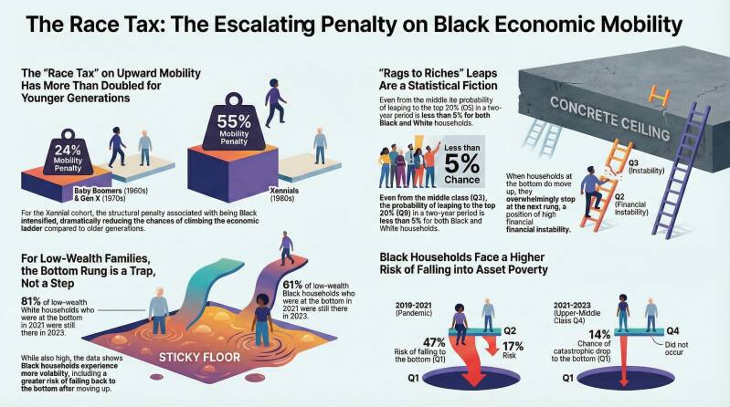 The Sticky Floor: 81% of low-wealth White households and 61% of low-wealth Black households remained at the bottom between 2021 and 2023.
